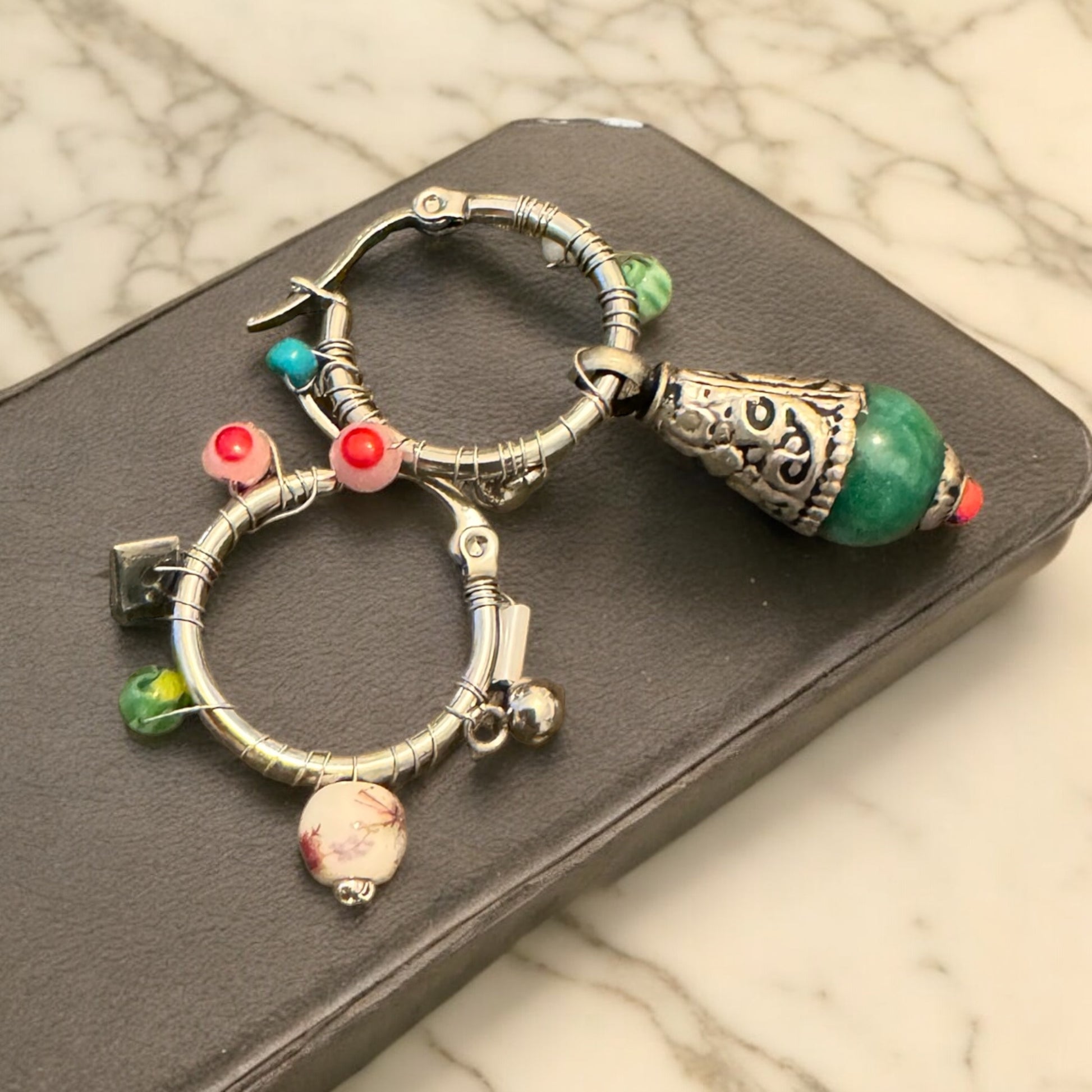 Ajoutez une touche d'originalité à vos tenues avec les boucles d'oreilles créoles BALI -ATELIER BLONDINETTES- en acier inoxydable argent. Les perles et breloques aux tons vert rouge et argent maintenues par un fil d'acier apportent une touche élégante. Affirmez votre personnalité avec ces boucles d'oreilles uniques !