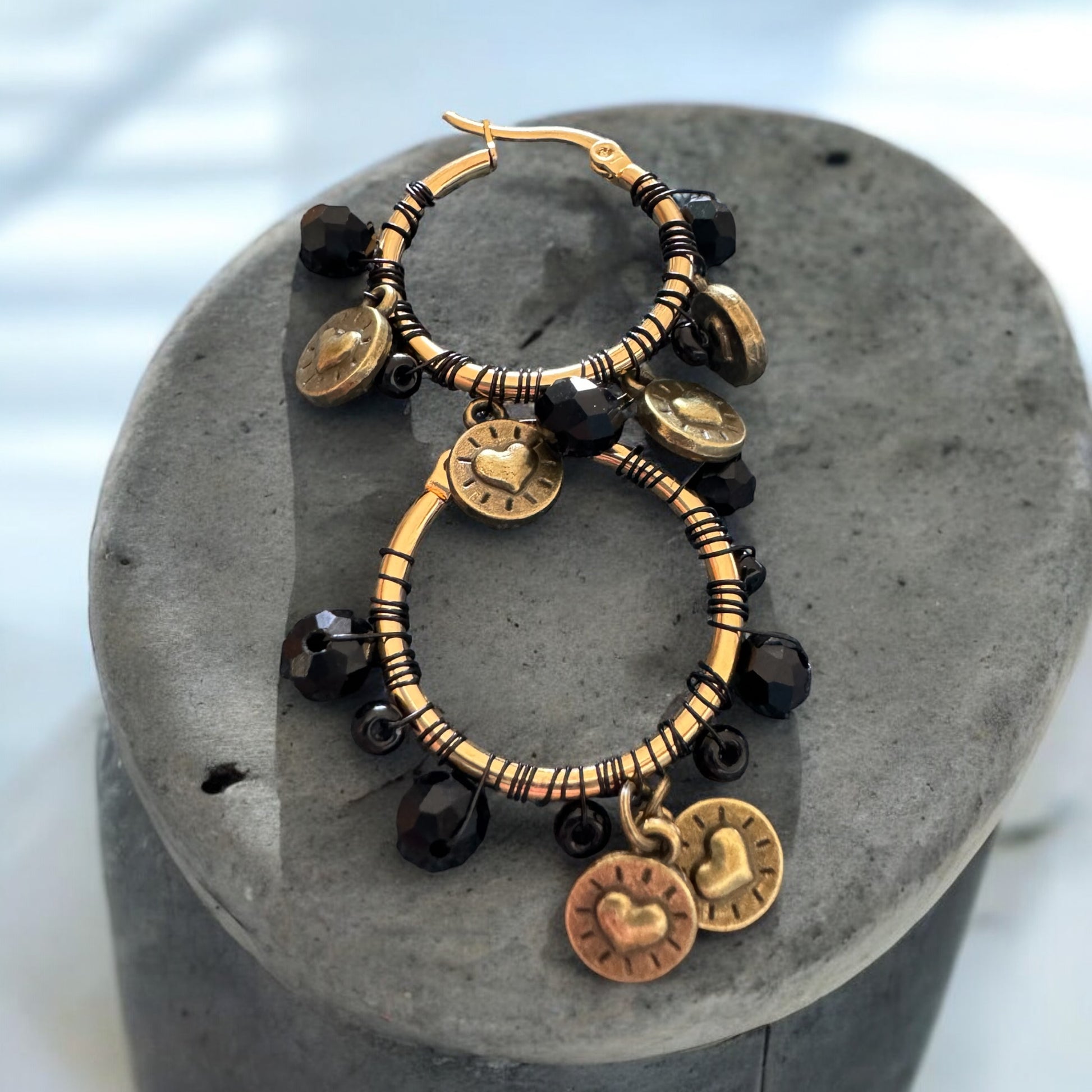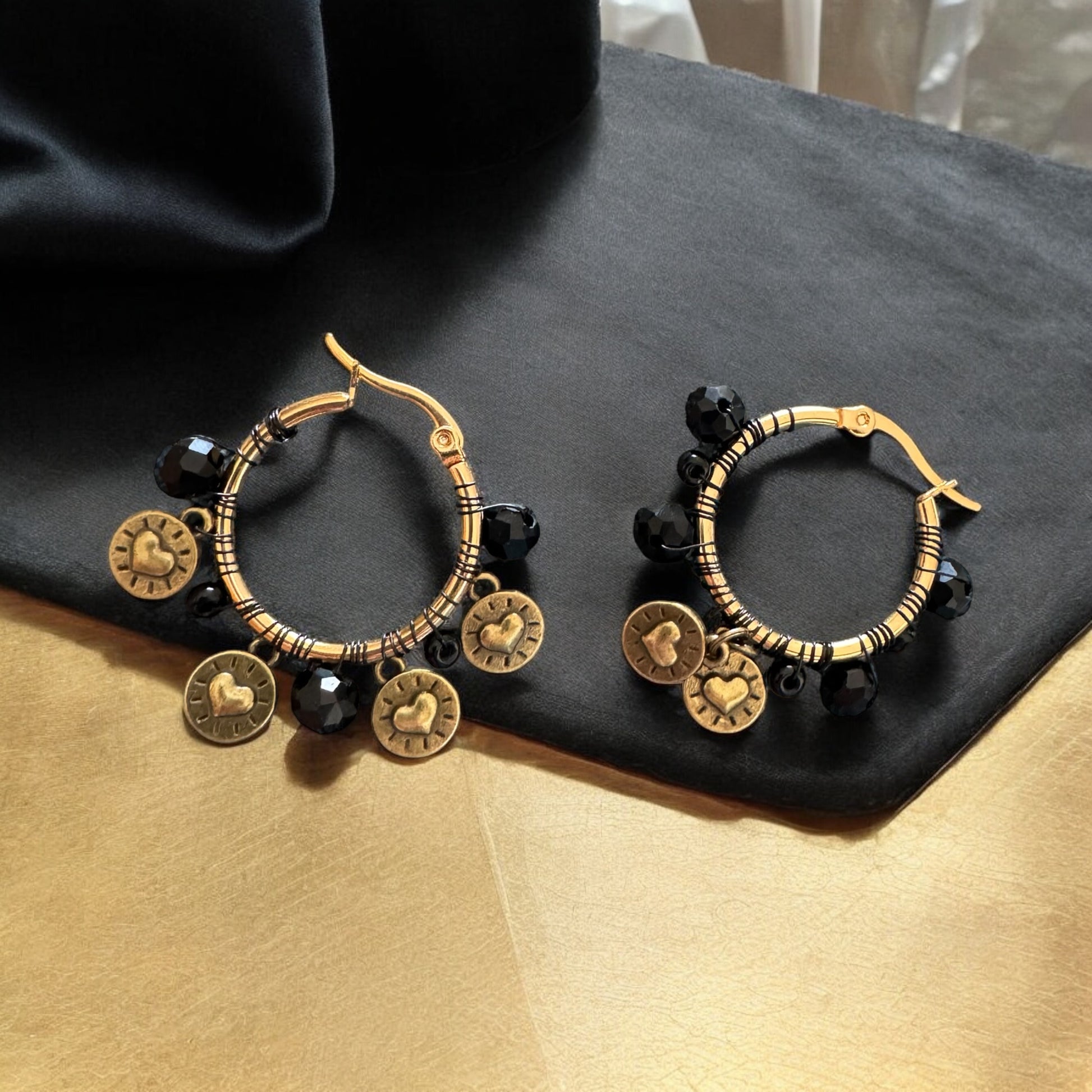 Ajoutez une touche d'originalité à vos tenues avec les boucles d'oreilles créoles LOLITA -ATELIER BLONDINETTES- en acier inoxydable doré. Les perles noires et les breloques dorées apportent une touche élégante et les fils d'acier noir ajoutent une touche de contraste. Affirmez votre personnalité avec ces boucles d'oreilles uniques et intemporelles !
