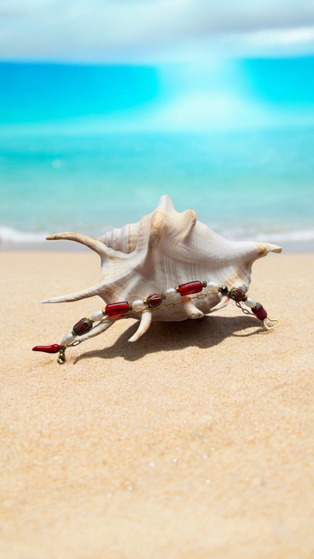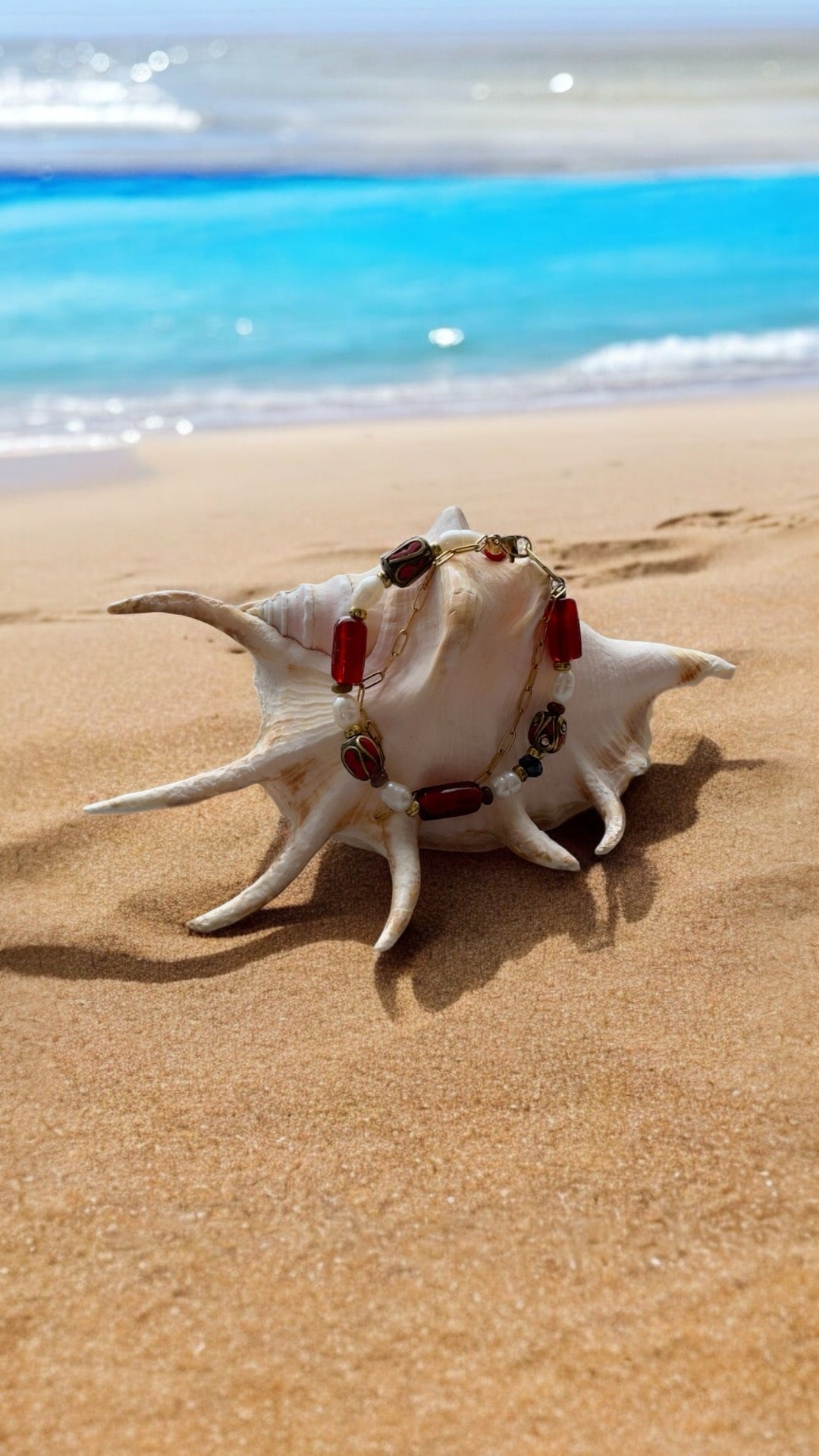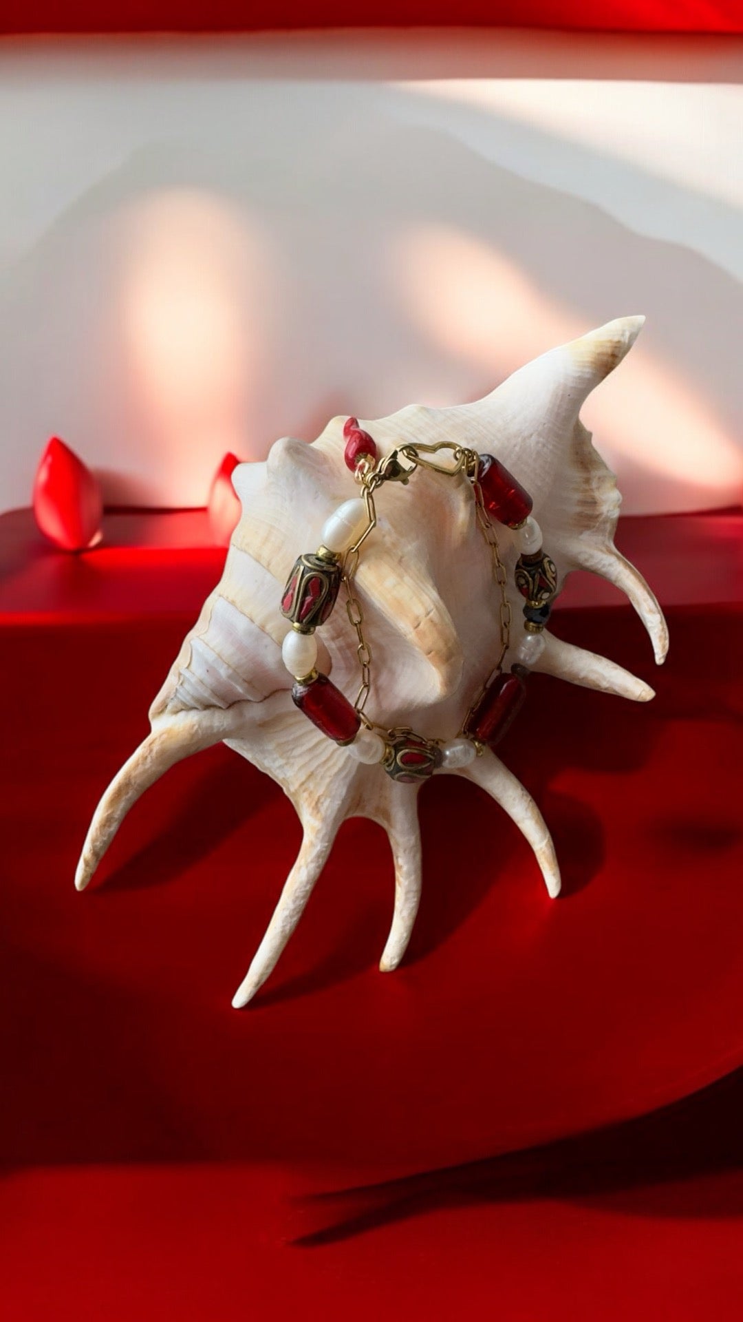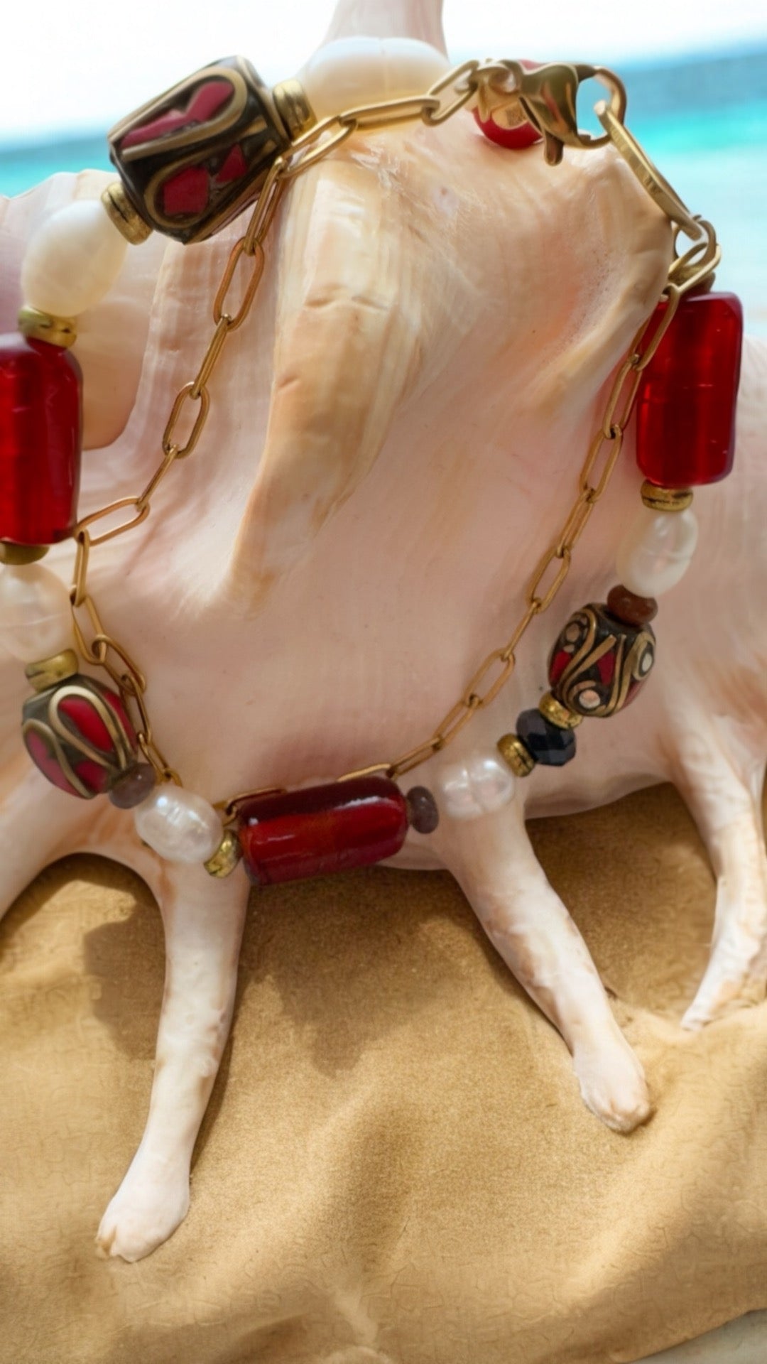 Le bracelet AGATHE-ATELIER BLONDINETTES- est un bijou délicat et féminin. Un premier bracelet perles de verre rouge flamboyantes qui s'entremêlent à des perles en céramique rouge et dorée ainsi que des perles d'eau douce. Un deuxième bracelet en maille fine en acier inoxydable doré. Les deux sont reliés à un coeur doré qui sert de fermoir, sur lequel est suspendu une breloque piment rouge.