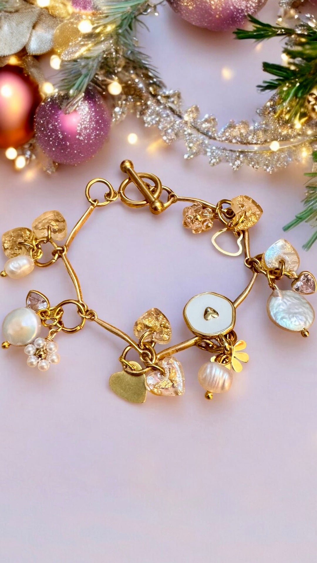 Découvrez notre bracelet CHERIE -ATELIER BLONDINETTES- en acier inoxydable doré orné de breloques dont des cœurs en résine transparente perlée avec de délicates touches de feuilles d'or, des breloques en acier inoxydable doré et des perles de nacre véritable. Parfait pour ajouter une touche de glamour et de raffinement à vos tenues. Son fermoir à bascule ajoutera une note pratique et élégante à votre look.