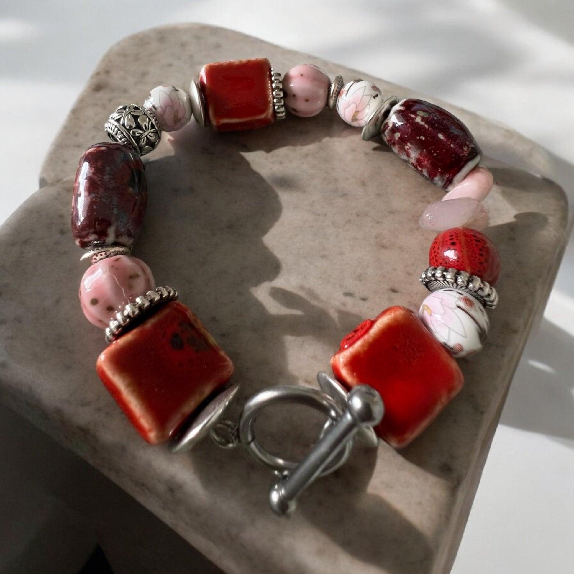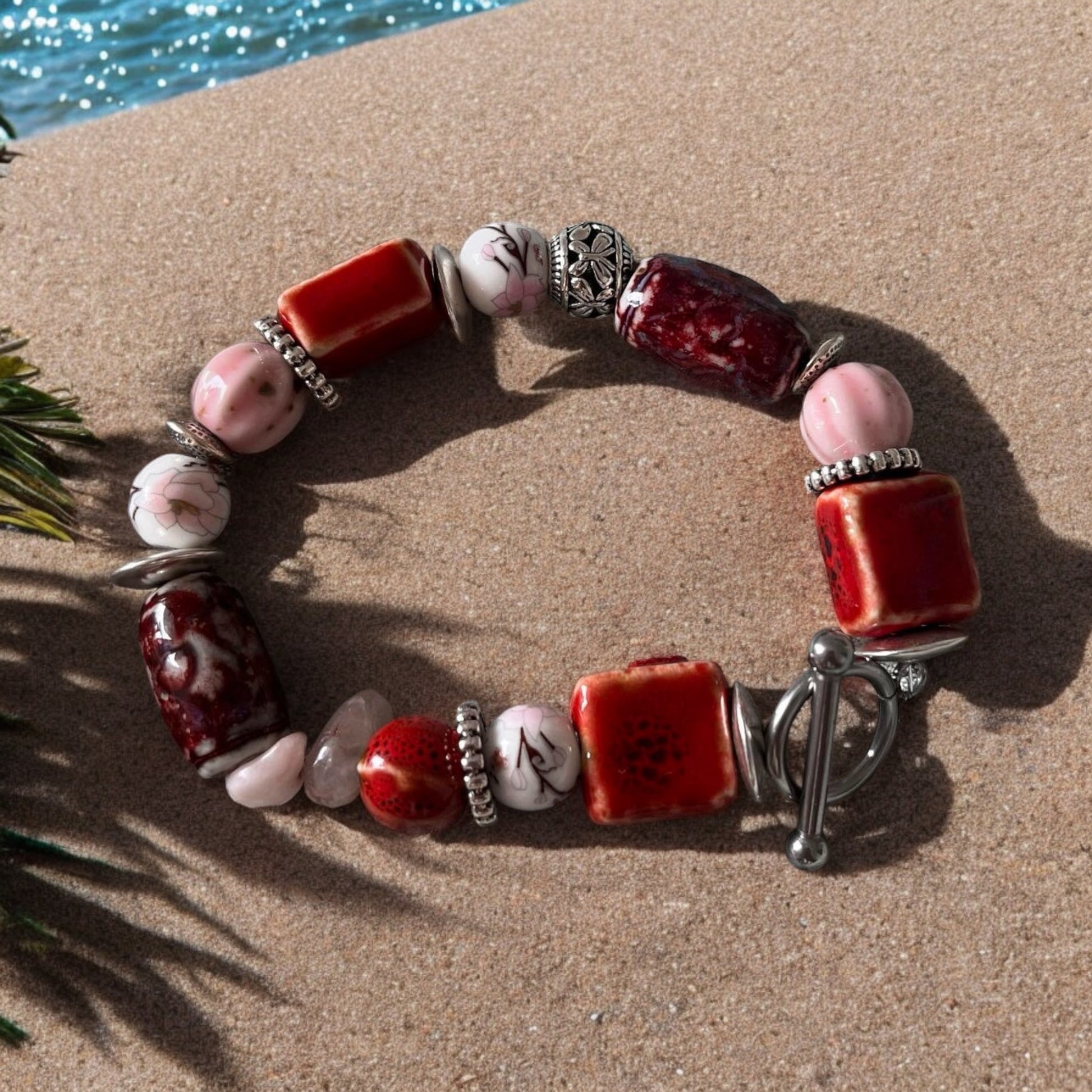 Réhaussez votre tenue avec notre bracelet mixte ROSIE -ATELIER BLONDINETTES-, créé dans des teintes de rose, rouge et argenté. La combinaison de perles en céramique, en acier et en pierres semi-précieuses respire la sophistication et ajoute une touche audacieuse à n'importe quelle tenue. Doté d'un fermoir robuste en acier inoxydable argent, ce bracelet est parfait pour Madame ou Monsieur ! Relevez le défi de l'élégance avec cette pièce unique et incontournable.