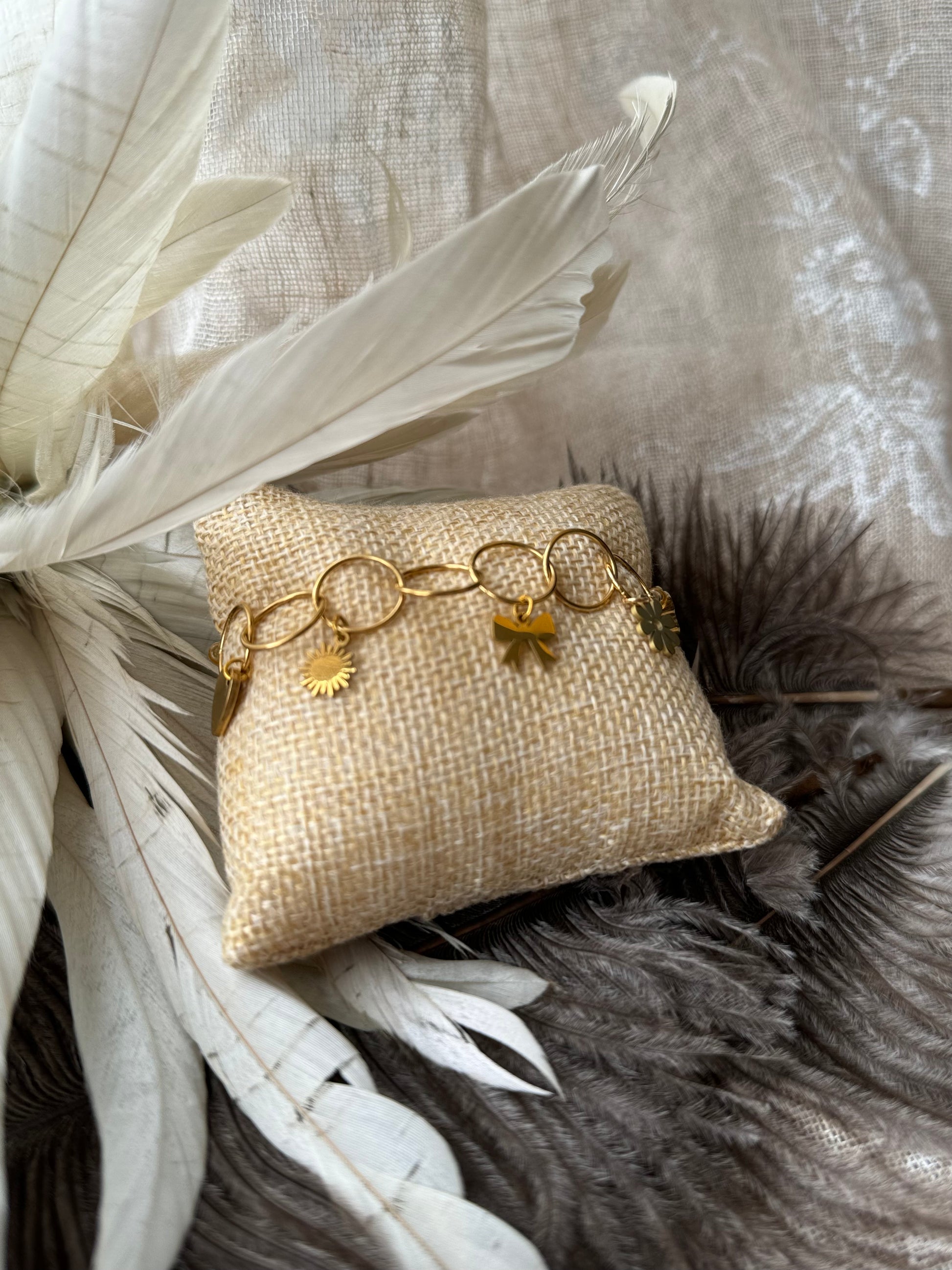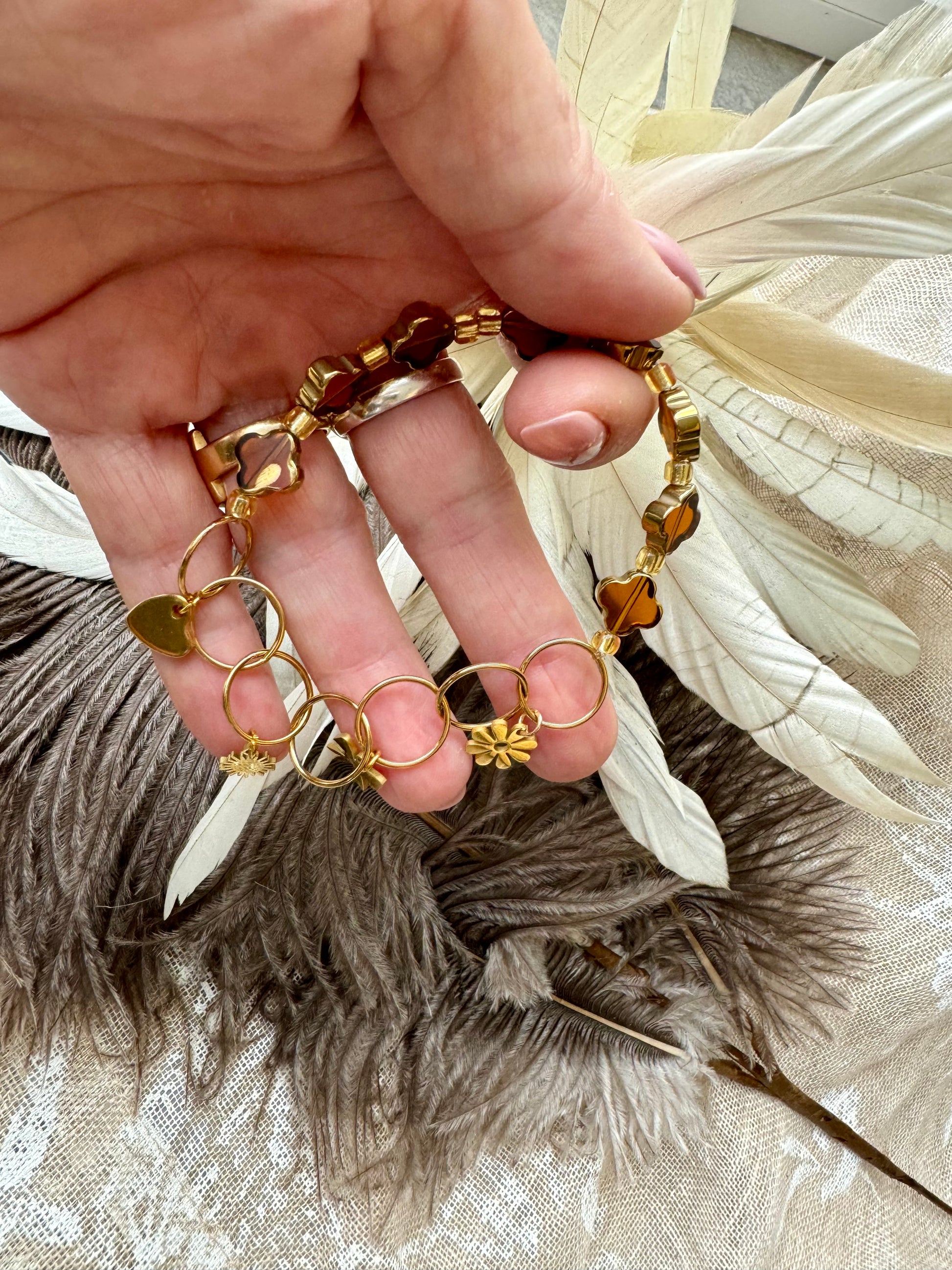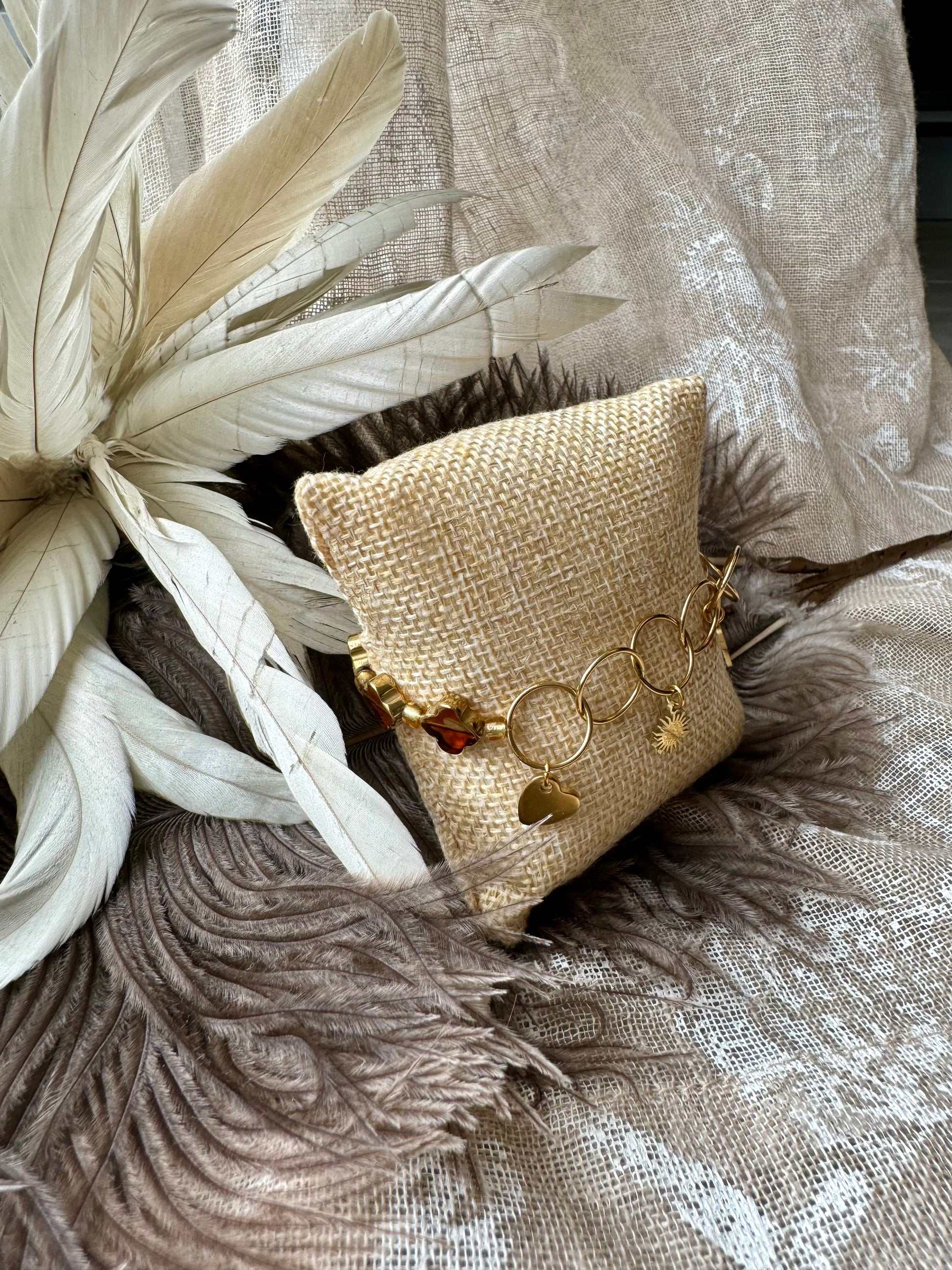 Le bracelet JEANNE -ATELIER BLONDINETTES- est un bijou délicat et féminin. Des perles ambrées s'entremêlent à des anneaux en acier inoxydable doré ornés de délicates breloques. Sa matière élastique s'adapte à tous les poignets.