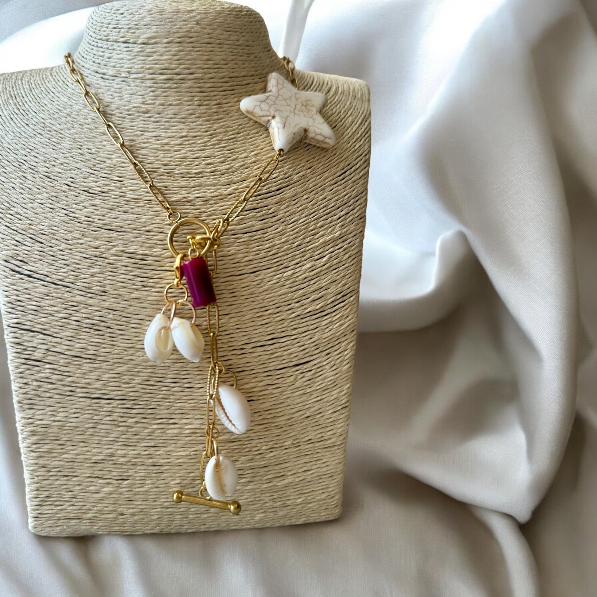 Sublimez votre bronzage avec notre collier ajustable STARLETTE -ATELIER BLONDINETTES- en acier inoxydable doré. Les délicats coquillages s'équilibrent délicatement à chaque mouvement, tandis que l'étoile en céramique de couleur naturel avec un effet nervuré doré sur un coté ajoute une touche de fantaisie. Une breloque supplémentaire en quartz rose apporte de la douceur et de la féminité à ce collier. Portez-le près du cou pour un look bohème chic, ou laissez-le danser plus bas pour une allure plus décontractée, en ajustant les breloques qui peuvent être associées ou portées séparément.