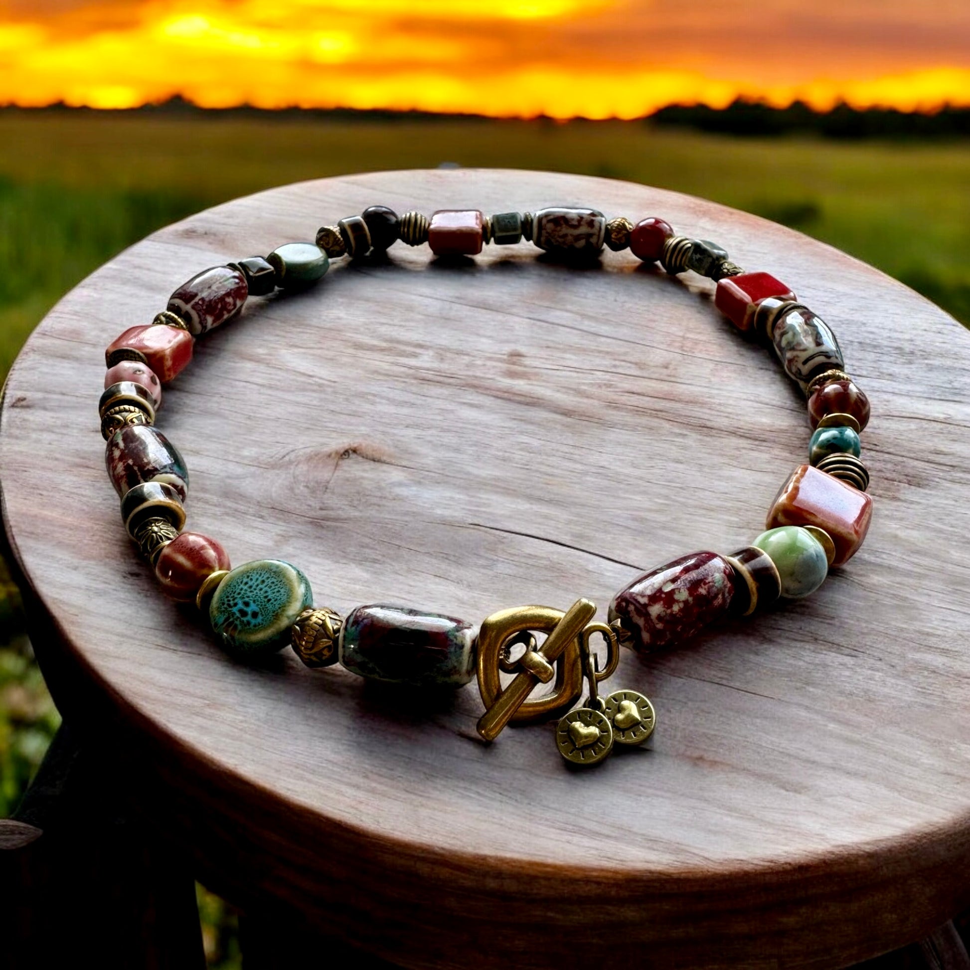 Sublimez votre cou avec notre collier unique BARBARA -ATELIER BLONDINETTES-, mêlant harmonieusement des éléments de céramique aux couleurs vibrantes du bleu et du rouge. Les formes et les tailles variées de ces perles créent un jeu de lumière envoûtant. Des billes en acier inoxydable doré viennent apporter une touche d'éclat supplémentaire à ce bijou artisanal. Le fermoir carré en T, sur lequel sont attachées deux breloques coeur, assure un confort optimal et une fermeture sécurisée du bijou. Une pièce maitresse à porter au quotidien pour un look bohème-chic ou pour accessoiriser une tenue de soirée...