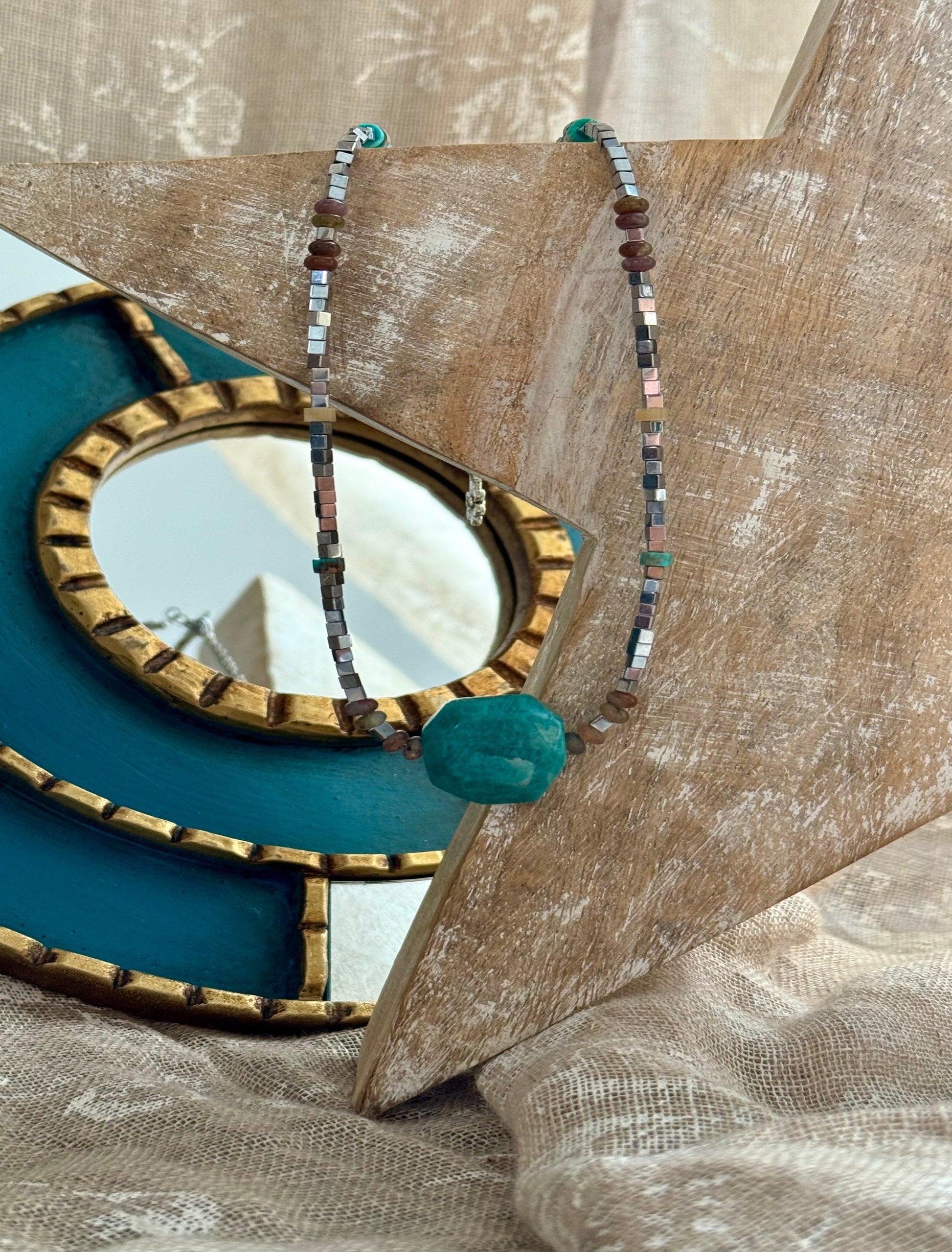 Ce collier ras du cou VAHEANA -ATELIER BLONDINETTES- est un véritable coup de cœur ! Sa pierre centrale turquoise, d'une couleur envoûtante, est entourée de perles cubiques en acier miroir argenté qui apportent une touche moderne, élégante, reflétant la lumière. Les petites perles rondelles de turquoise et de nacre ajoutent une note de douceur et de raffinement. Un bijou parfait pour celles qui aiment les pièces uniques et originales.