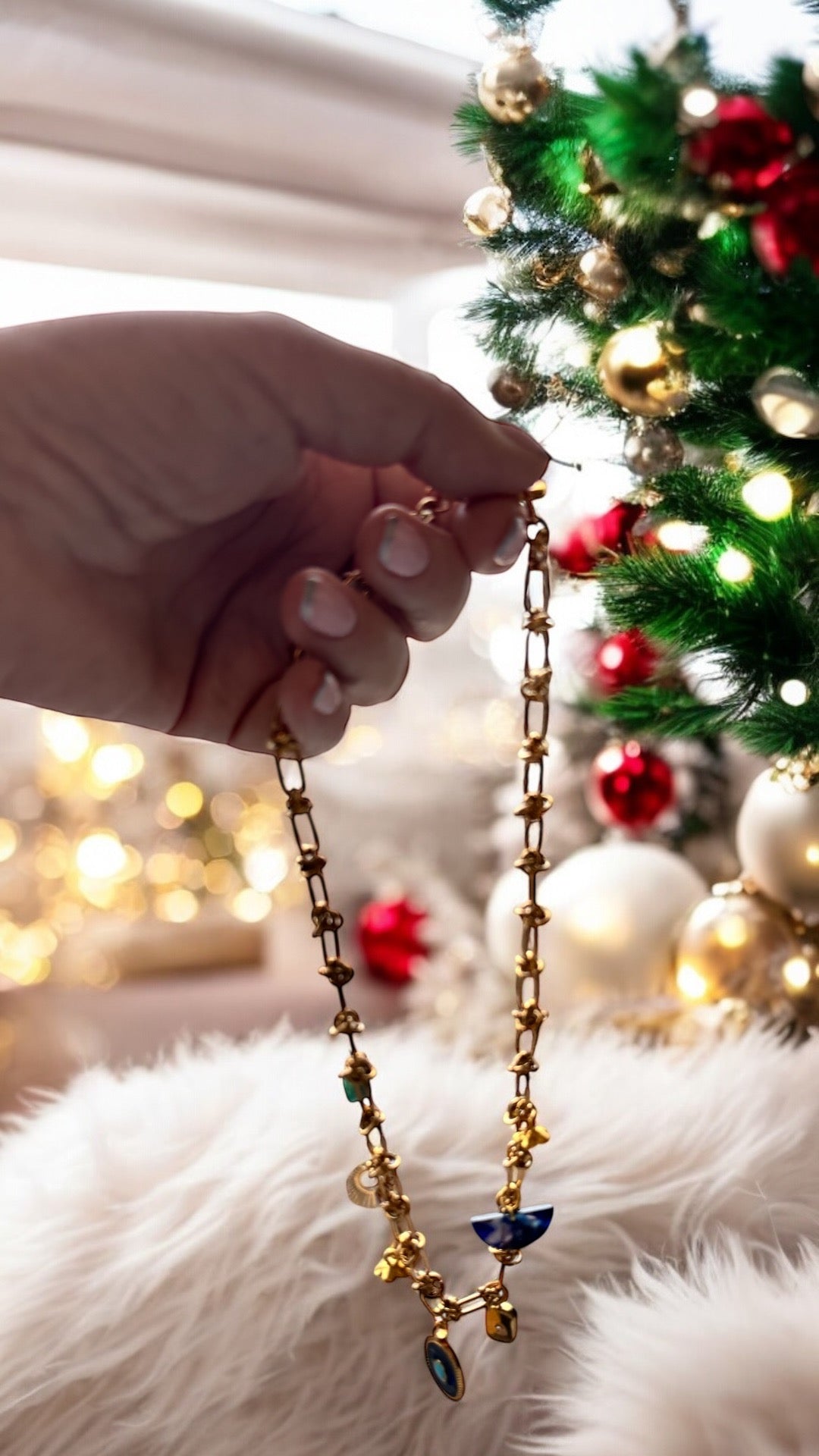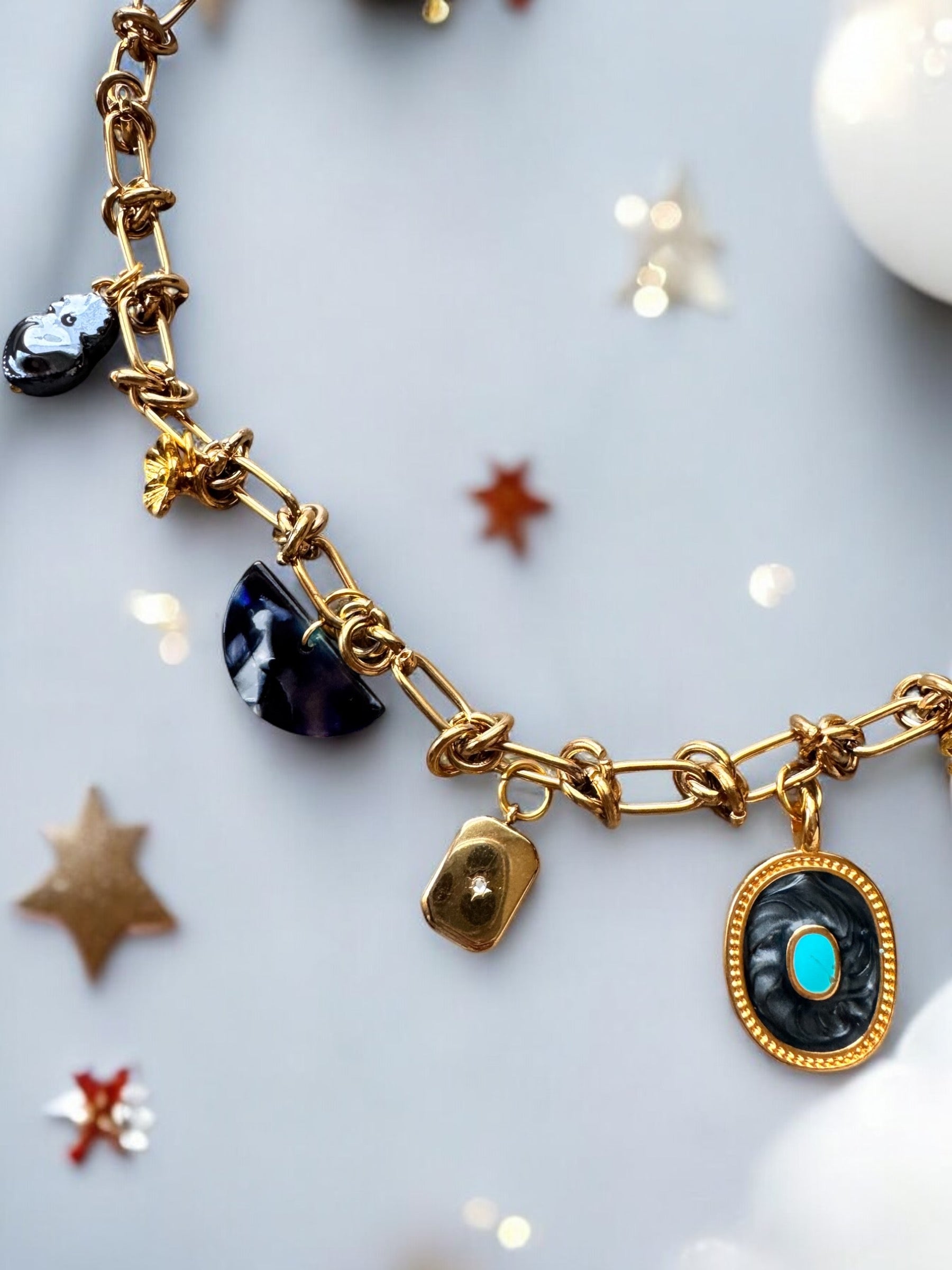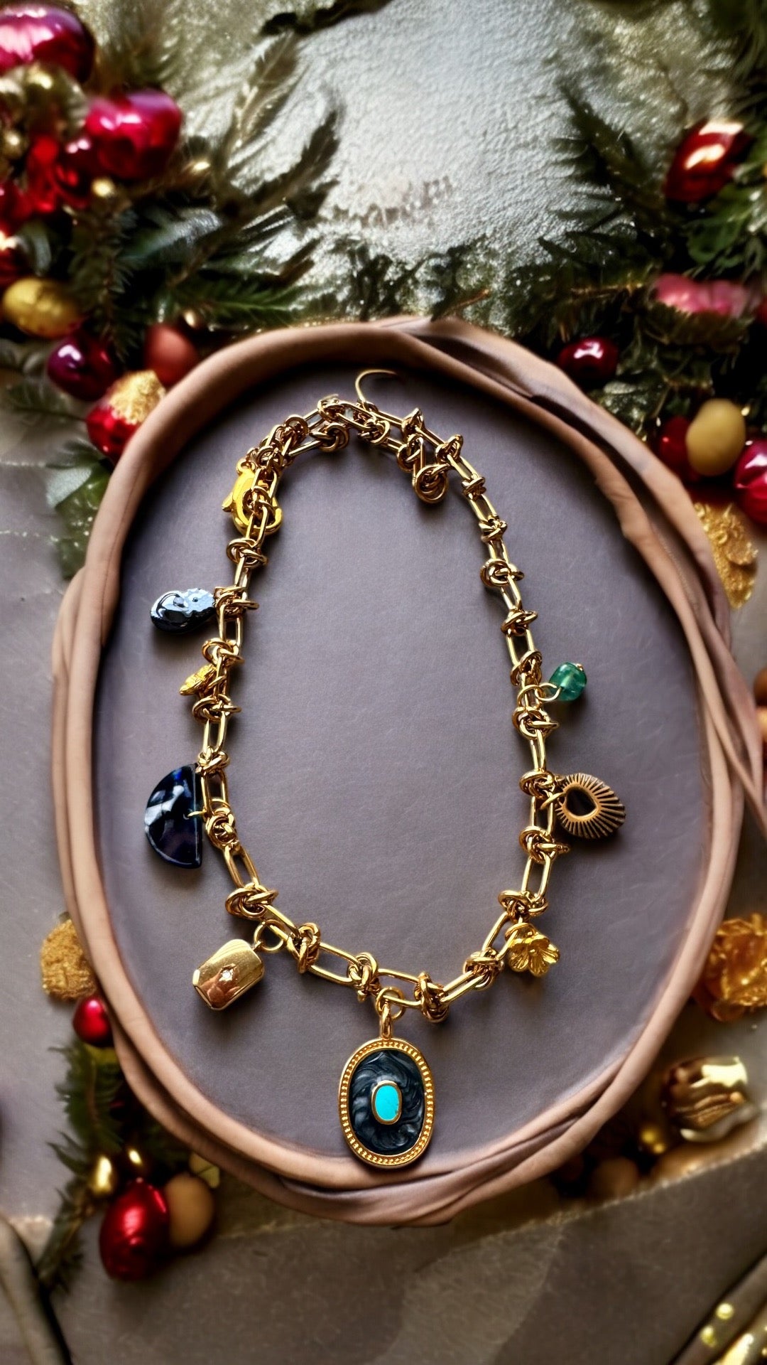 Sublimez votre décolleté avec notre collier CARLA -ATELIER BLONDINETTES - en acier inoxydable doré. Sa chaîne aux maillons entrelacés soutient une multitude de breloques aux formes variées : médaillons, cœurs, fleurs, perles de verre bleues, éléments géométriques... Un mélange harmonieux au contraste saisissant de matières et de couleurs pour un bijou aussi original qu'élégant.