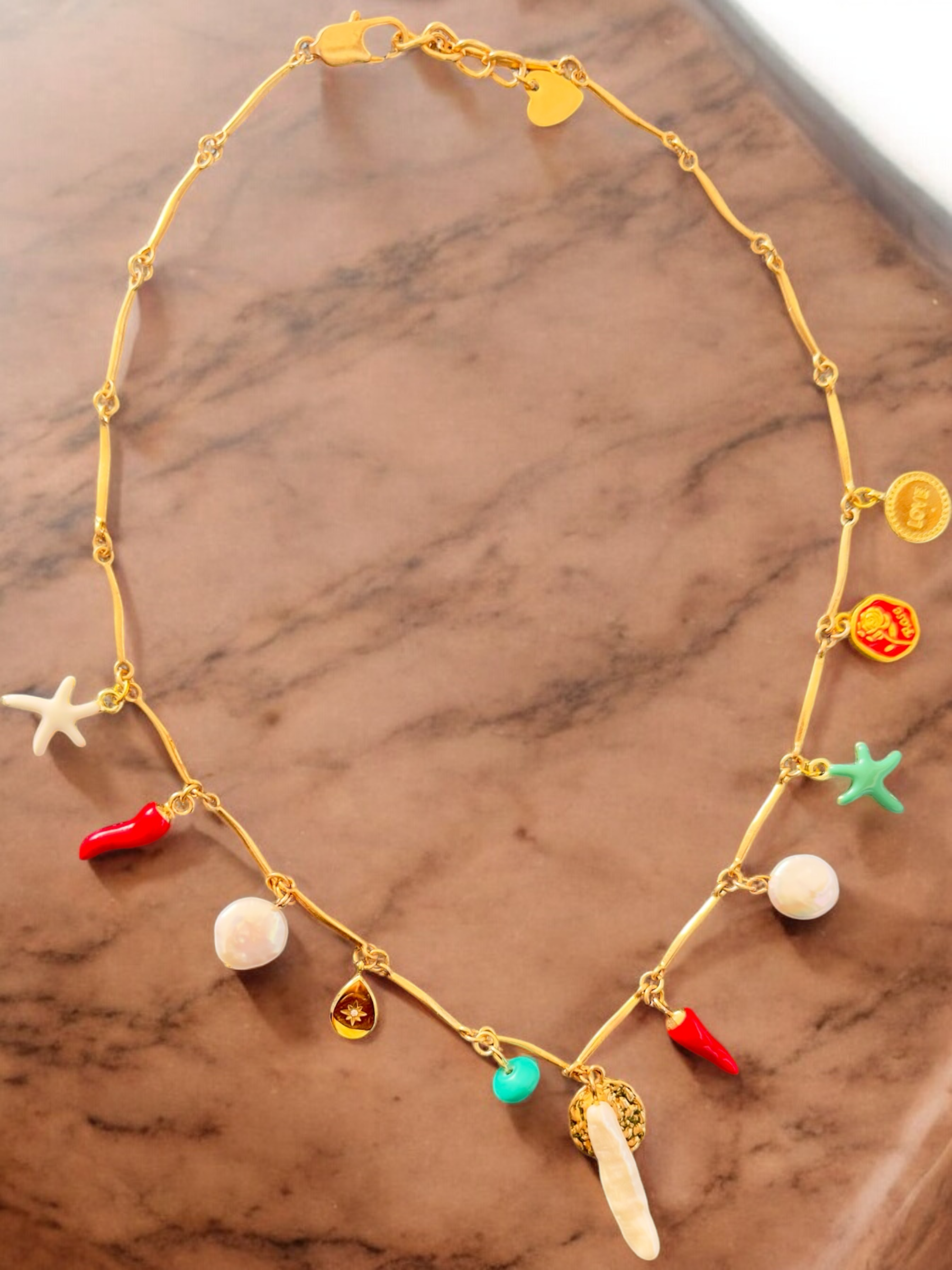 Complétez votre tenue avec élégance grâce au collier GINA -ATELIER BLONDINETTES-. Ses breloques colorées en turquoise, rouge, doré et perles de nacre véritable ajoutent une touche élégante et tendance. Associez-le avec une tenue décontractée ou habillée pour une touche de sophistication. Fabriqué en acier inoxydable doré de haute qualité, ce collier unique est à la fois durable et raffiné.