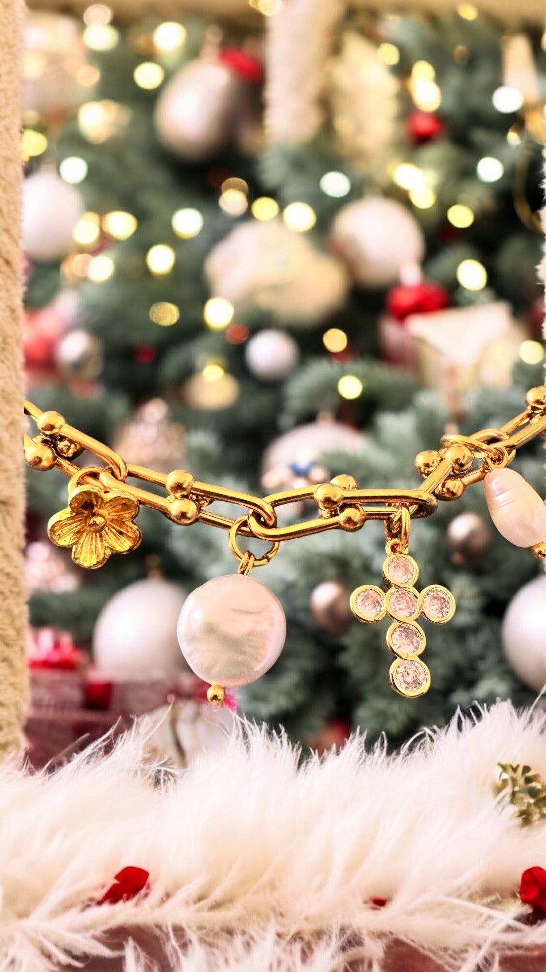 Sa chaîne délicate en maille forçat épouse délicatement les courbes du cou et est rehaussée de breloques délicates aux teintes nacrées et dorées, créant ainsi un bijou romantique et raffiné.