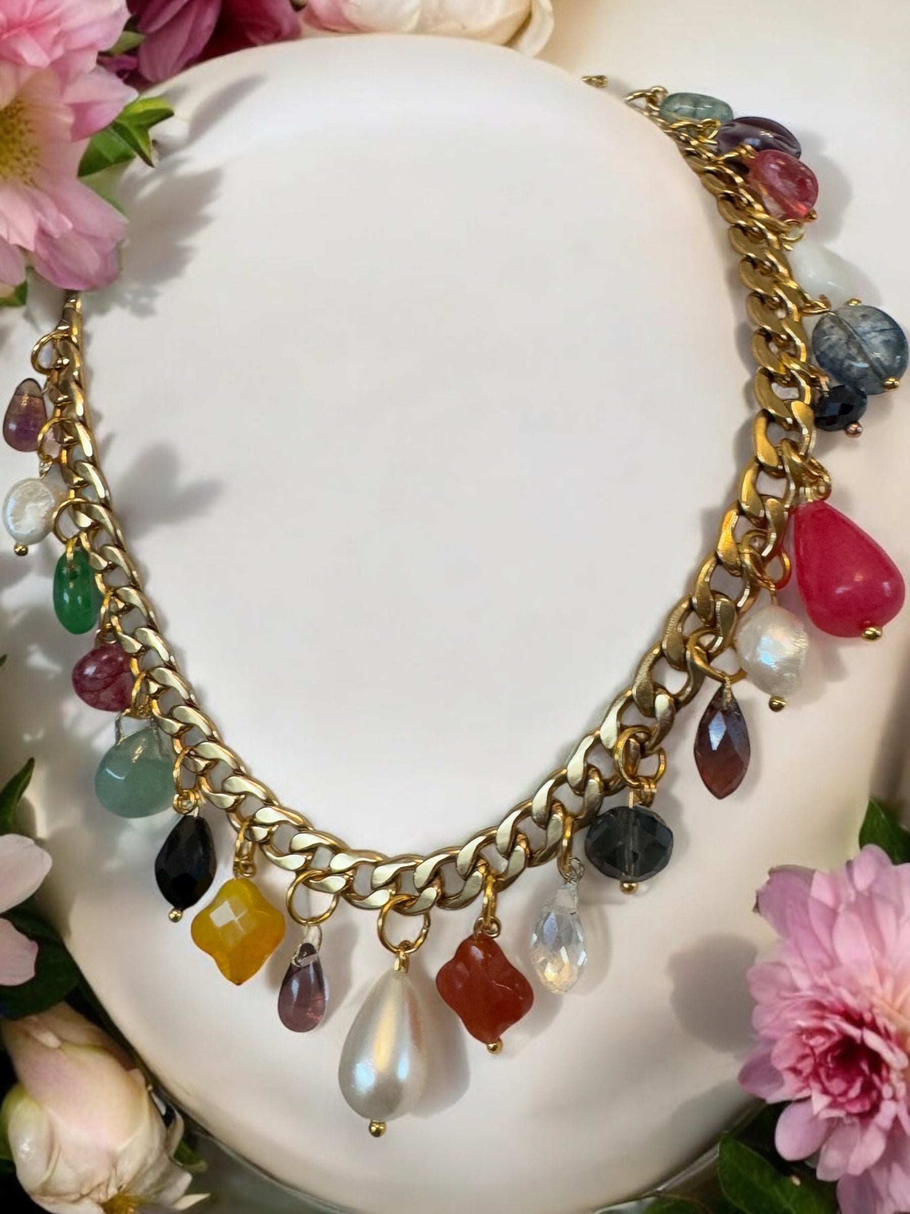 Un arc-en-ciel autour de ton cou ! Ce collier ras de cou QUEEN -ATELIER BLONDINETTES- est une véritable explosion de couleurs et de formes. Des perles rondes, ovales, en forme de goutte... Chacune est unique et apporte sa touche de fantaisie. On adore la chaîne en grosse maille gourmette qui apporte toute l’originalité et le contraste avec les breloques. Un bijou artisanal et coloré qui ne manquera pas de faire tourner les têtes.