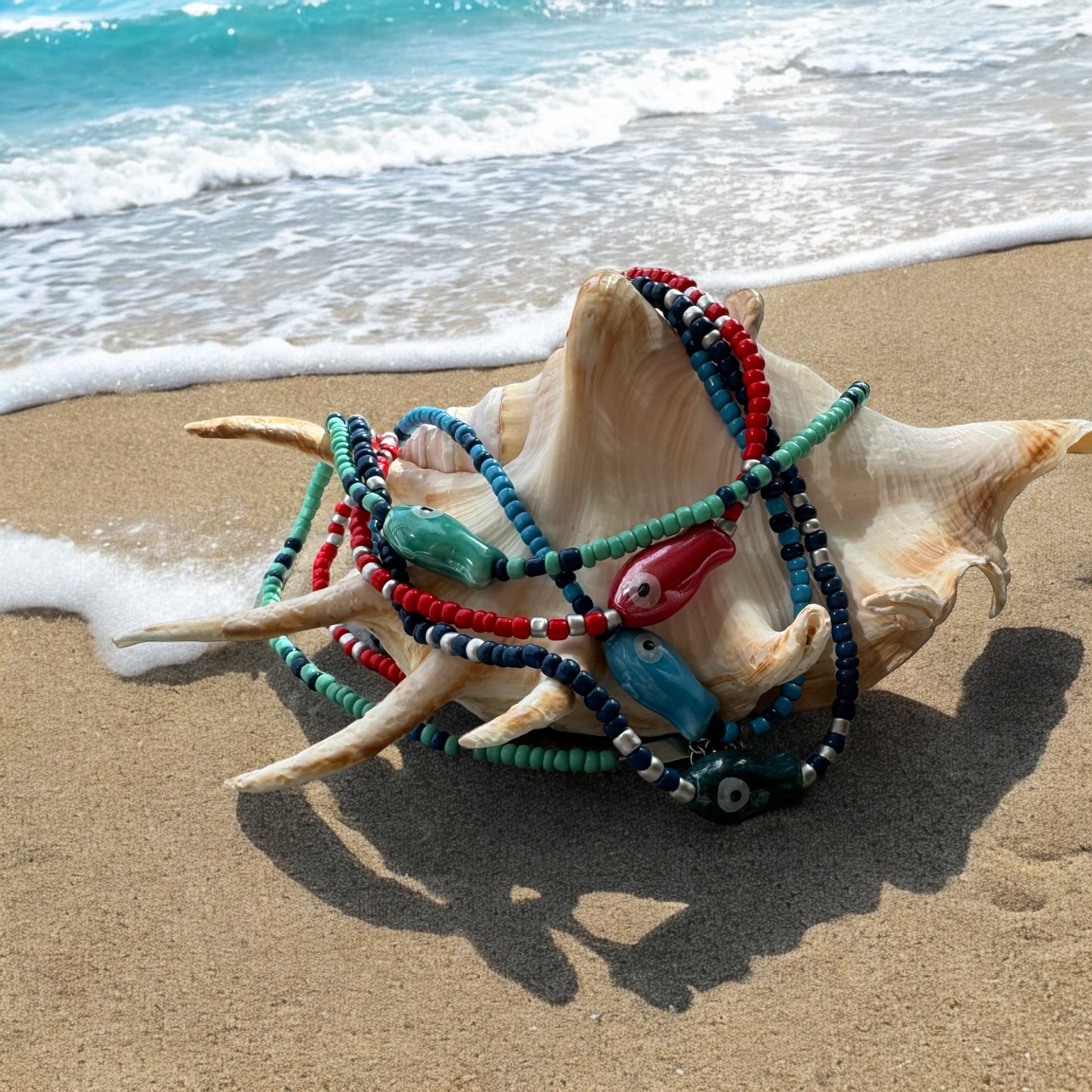 Découvrez le collier ras du cou MARINIERE M -ATELIER BLONDINETTES- pour égayer votre été ! Perles marines et argent, ornées d'un poisson en céramique marine, pour un look audacieux et joyeux. Osez pimenter votre style avec cette nouvelle pièce estivale qui saura illuminer vos tenues d'été. A porter seul ou en superposition avec les autres coloris pour un look encore plus fun !