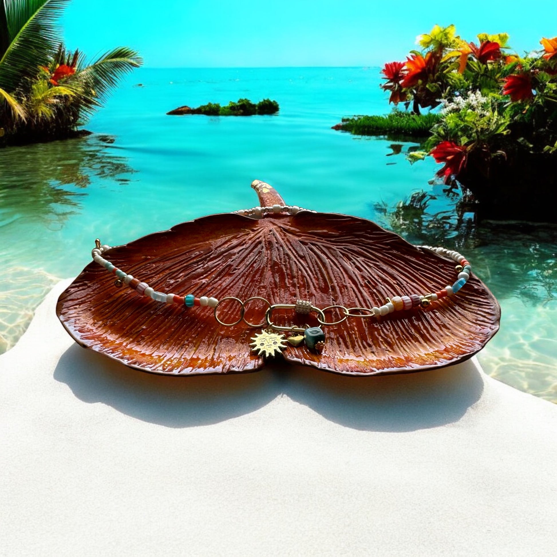 Transformez vos tenues en y ajoutant une touche de soleil et de féminité avec le collier SUNSET -ATELIER BLONDINETTES-. Ses perles aux couleurs vibrantes de turquoise, doré et blanc, agrémentées d'une touche d'orange, ainsi que ses breloques sur le magnifique fermoir mousqueton, apportent originalité et élégance. Idéal pour un look estival et audacieux !