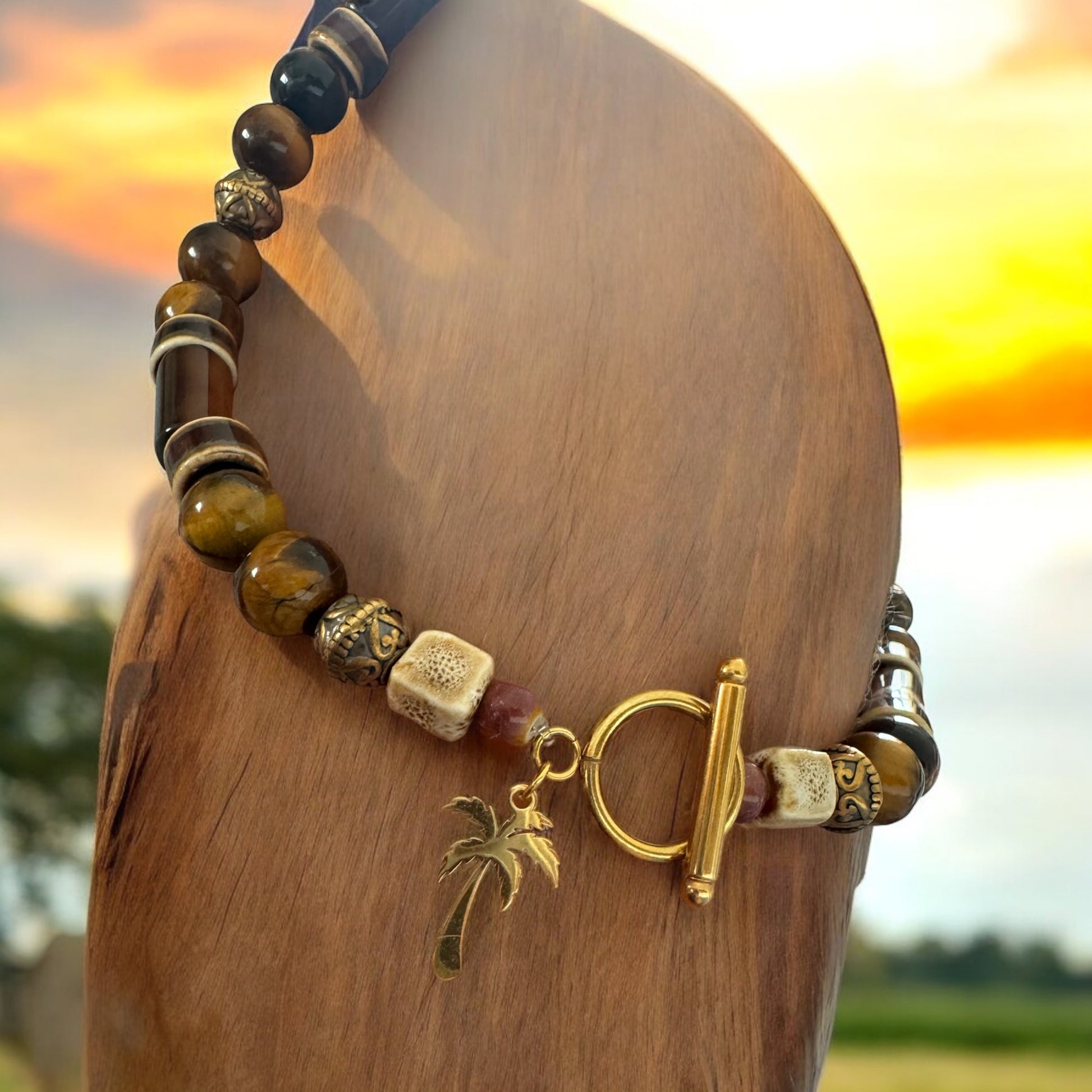 Envie de vacances éternelles ? Ce collier AMBRE -ATELIER BLONDINETTES- est fait pour vous ! Avec ses perles oeil de tigre qui vont donneront des super pouvoirs et l'ambre qui vous remplira d'énergie positive, vous serez prêt(e) à affronter les défis du quotidien... ou simplement vous détendre sur votre canapé. Le petit plus ? Le pendentif palmier, en acier inoxydable doré accroché au fermoir en T, vous transportera directement sur une plage de rêve...